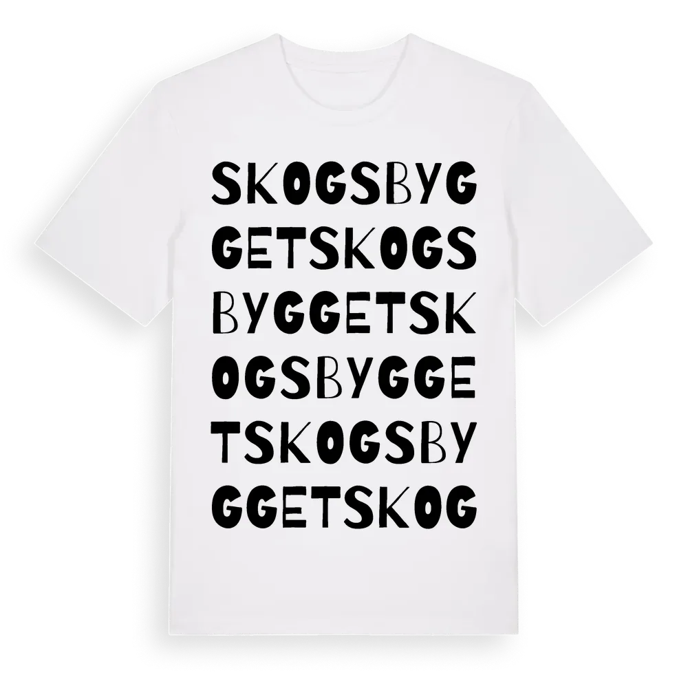 Skogsbygget ordlek t-shirt är inspirerad av Skogsbygget i Skåne län, Sverige. Tröjan är designad för dig som har en speciell koppling till platsen – oavsett om du bor här, har rötterna här eller bara älskar Skogsbygget.