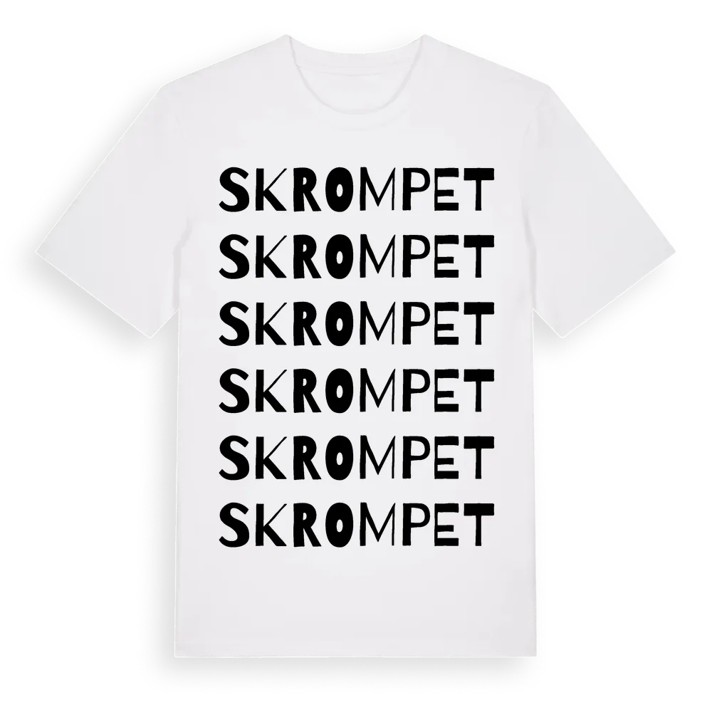 Skrompet ordlek t-shirt är inspirerad av Skrompet i Skåne län, Sverige. Tröjan är designad för dig som har en speciell koppling till platsen – oavsett om du bor här, har rötterna här eller bara älskar Skrompet.