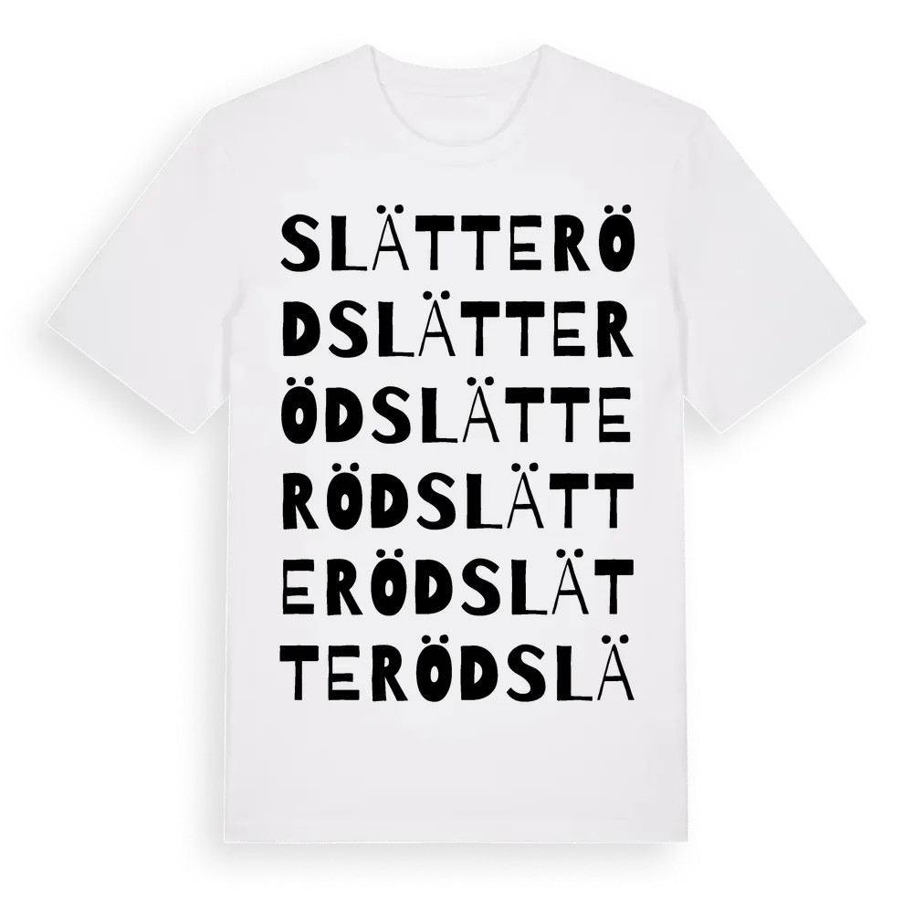 Slätteröd ordlek t-shirt är inspirerad av byn Slätteröd i Skåne län, Sverige. Tröjan är designad för dig som har en speciell koppling till platsen – oavsett om du bor här, har rötterna här eller bara älskar Slätteröd.