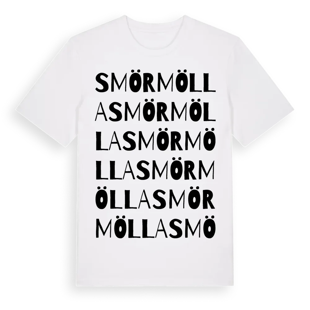 Smörmölla ordlek t-shirt är inspirerad av Smörmölla i Skåne län, Sverige. Tröjan är designad för dig som har en speciell koppling till platsen – oavsett om du bor här, har rötterna här eller bara älskar Smörmölla.
