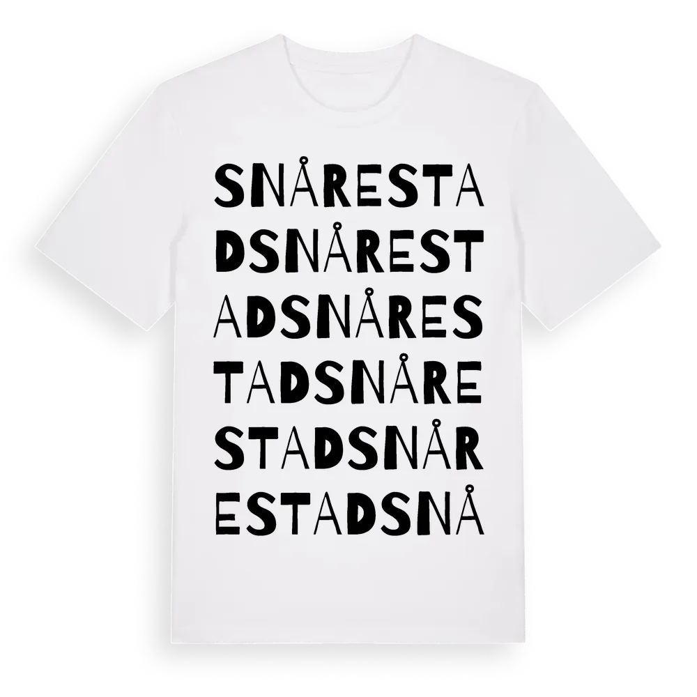 Snårestad ordlek t-shirt är inspirerad av byn Snårestad i Skåne län, Sverige. Tröjan är designad för dig som har en speciell koppling till platsen – oavsett om du bor här, har rötterna här eller bara älskar Snårestad.