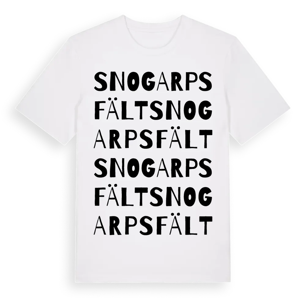En ordlek byggd på Snogarpsfälts namn. Subtilt och klurig – ett motiv som bara de som verkligen känner platsen fullt ut förstår. Premium bomull, unisex – från Snogarpsfält i Skåne län.