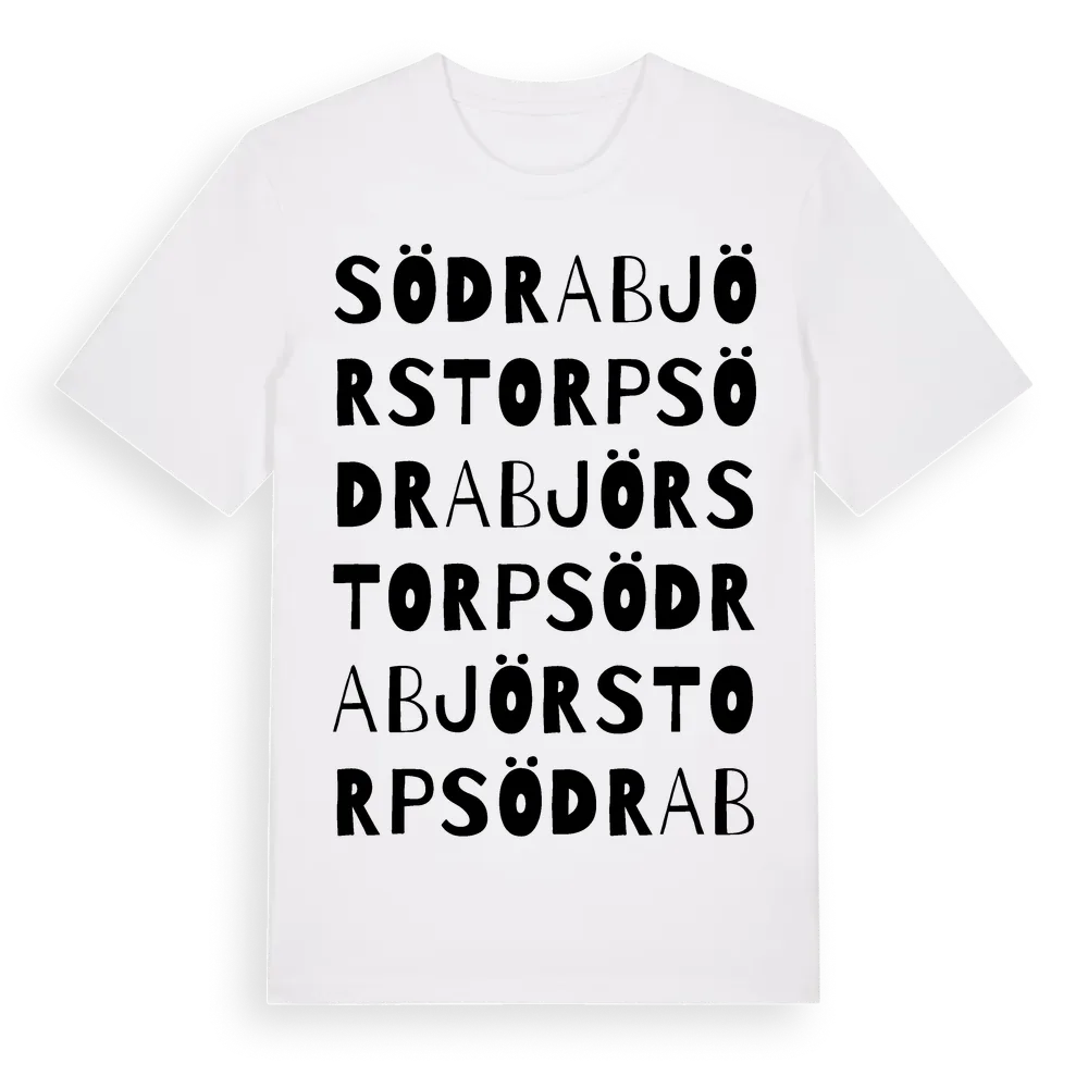 Södra Björstorp ordlek t-shirt är inspirerad av Södra Björstorp i Skåne län, Sverige. Tröjan är designad för dig som har en speciell koppling till platsen – oavsett om du bor här, har rötterna här eller bara älskar Södra Björstorp.