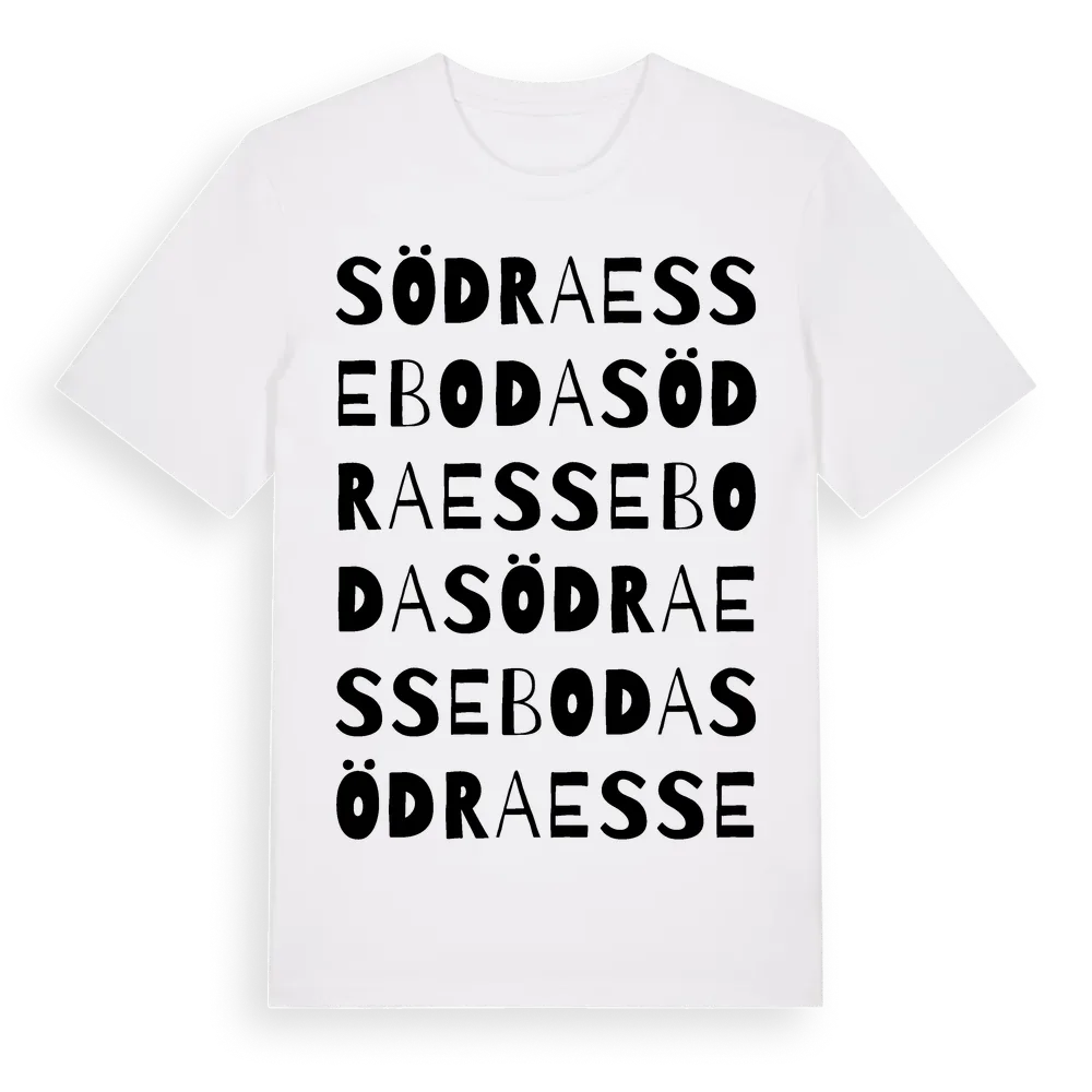 Södra Esseboda ordlek t-shirt är inspirerad av byn Södra Esseboda i Skåne län, Sverige. Tröjan är designad för dig som har en speciell koppling till platsen – oavsett om du bor här, har rötterna här eller bara älskar Södra Esseboda.