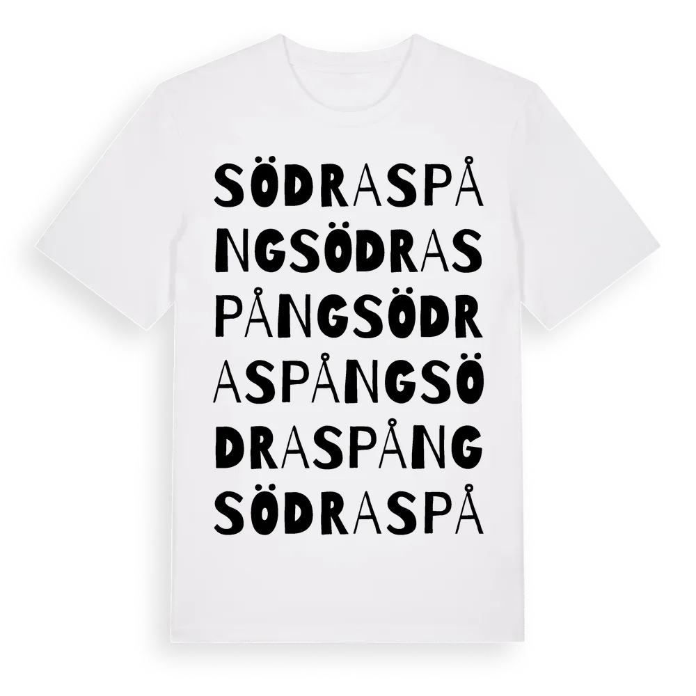 Södra Spång ordlek t-shirt är inspirerad av Södra Spång i Skåne län, Sverige. Tröjan är designad för dig som har en speciell koppling till platsen – oavsett om du bor här, har rötterna här eller bara älskar Södra Spång.
