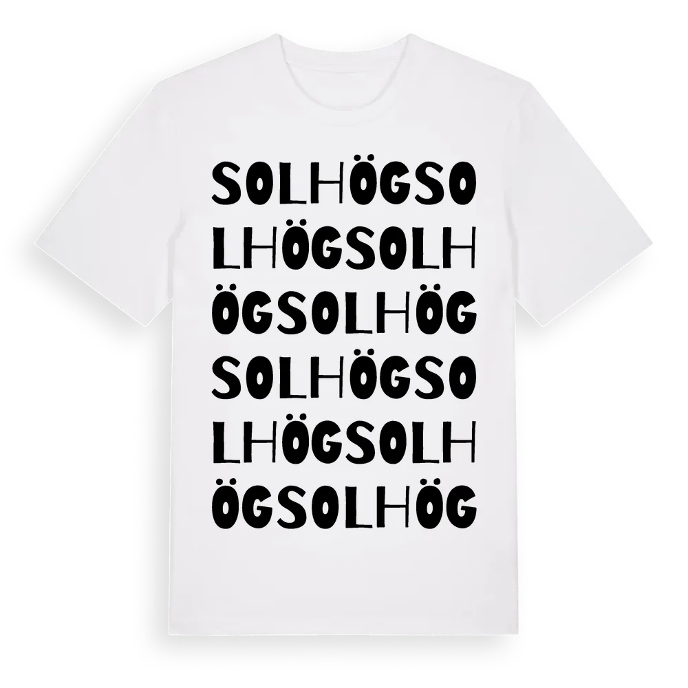 Solhög ordlek t-shirt är inspirerad av Solhög i Skåne län, Sverige. Tröjan är designad för dig som har en speciell koppling till platsen – oavsett om du bor här, har rötterna här eller bara älskar Solhög.