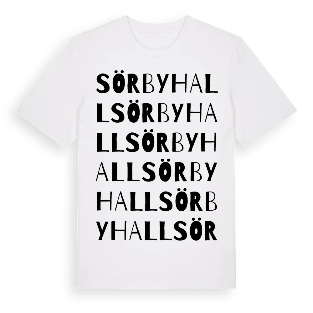 Sörbyhall ordlek t-shirt är inspirerad av Sörbyhall i Skåne län, Sverige. Tröjan är designad för dig som har en speciell koppling till platsen – oavsett om du bor här, har rötterna här eller bara älskar Sörbyhall.