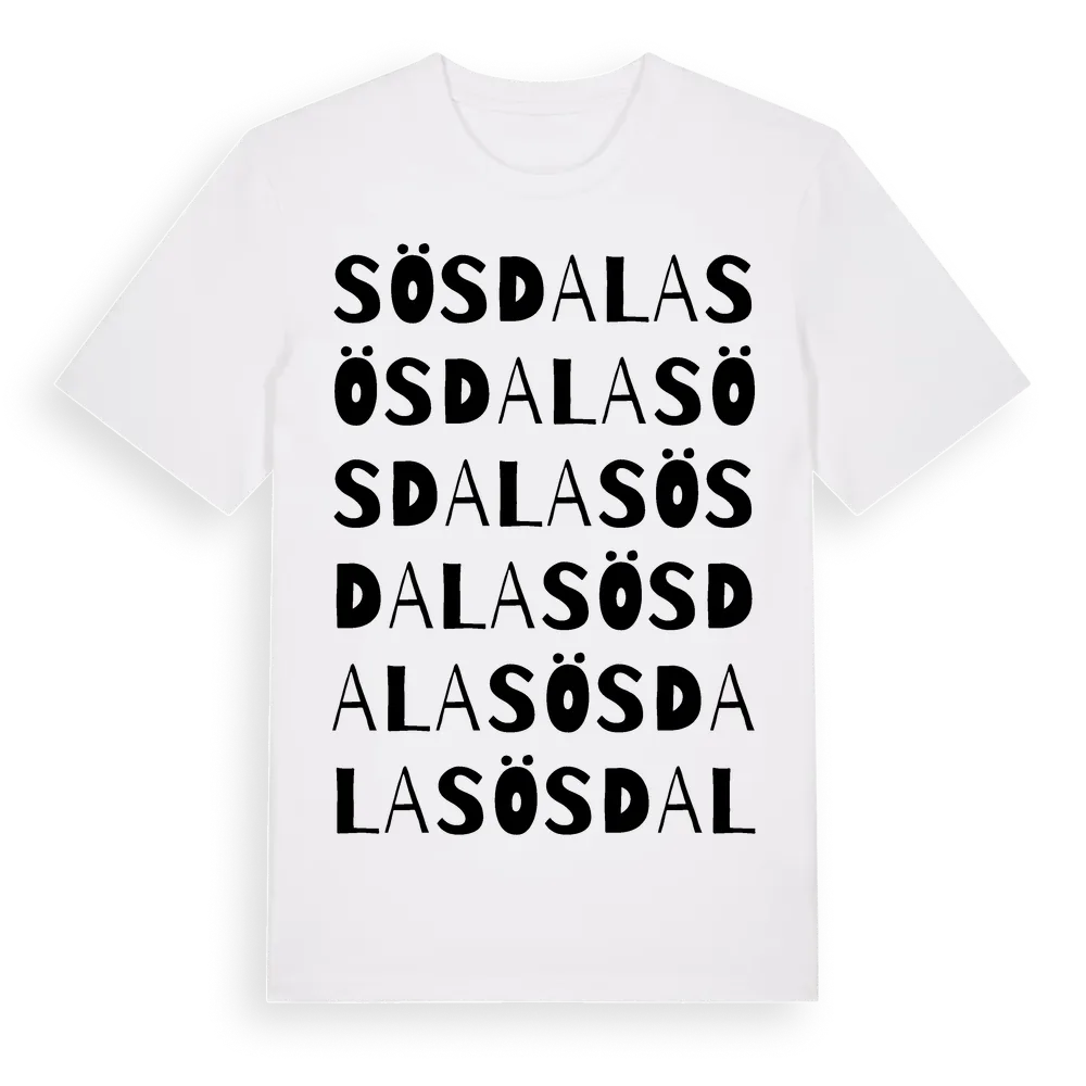 En ordlek byggd på Sösdalas namn. Subtilt och klurig – ett motiv som bara de som verkligen känner platsen fullt ut förstår. Premium bomull, unisex – från byn Sösdala i Skåne län.