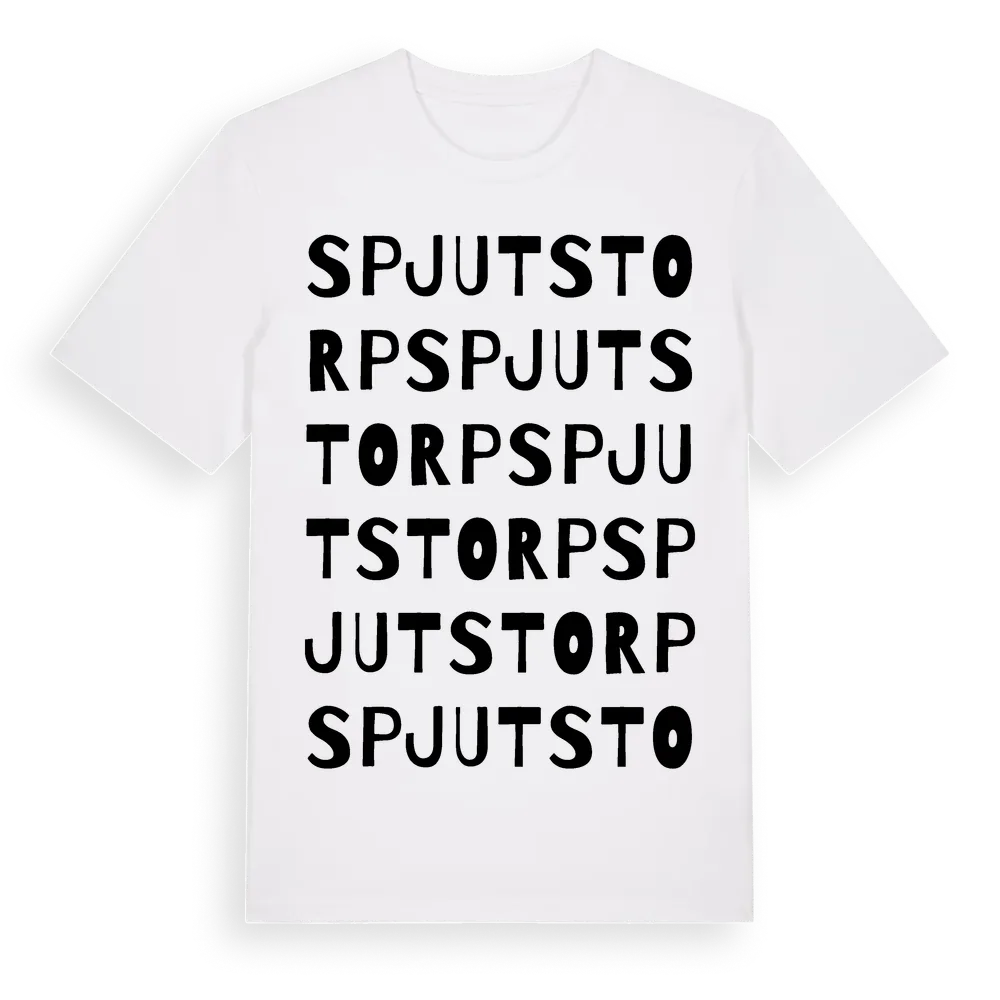 Spjutstorp ordlek t-shirt är inspirerad av byn Spjutstorp i Skåne län, Sverige. Tröjan är designad för dig som har en speciell koppling till platsen – oavsett om du bor här, har rötterna här eller bara älskar Spjutstorp.