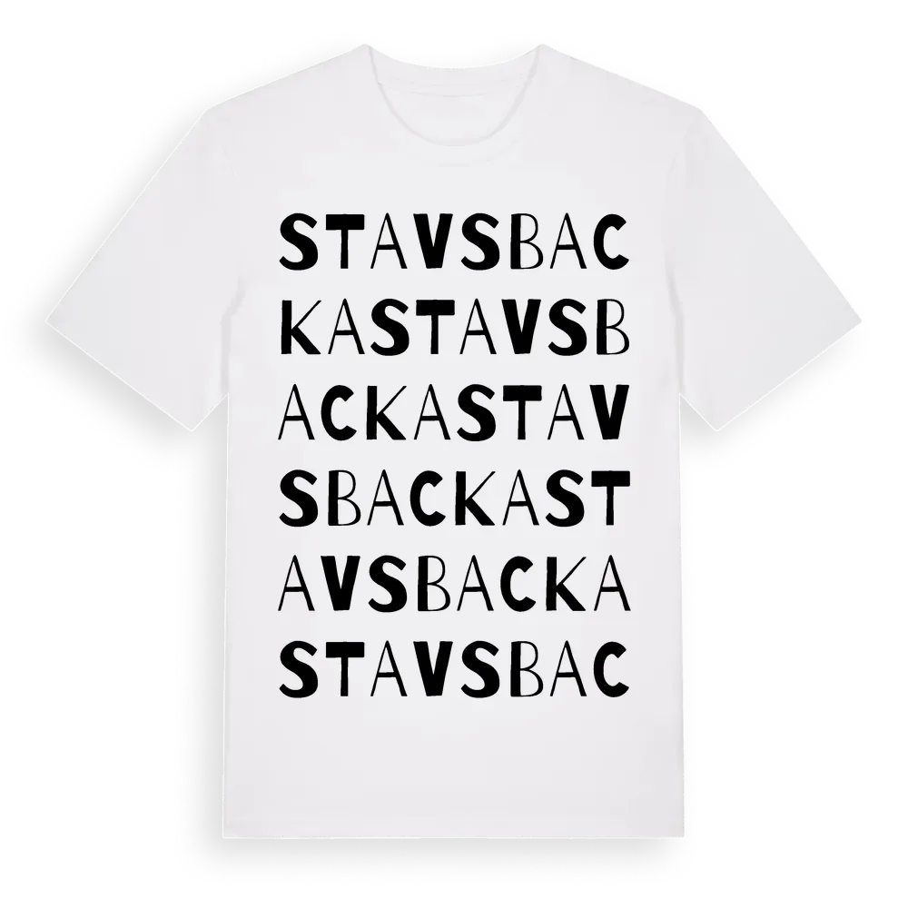 Stavsbacka ordlek t-shirt är inspirerad av Stavsbacka i Skåne län, Sverige. Tröjan är designad för dig som har en speciell koppling till platsen – oavsett om du bor här, har rötterna här eller bara älskar Stavsbacka.