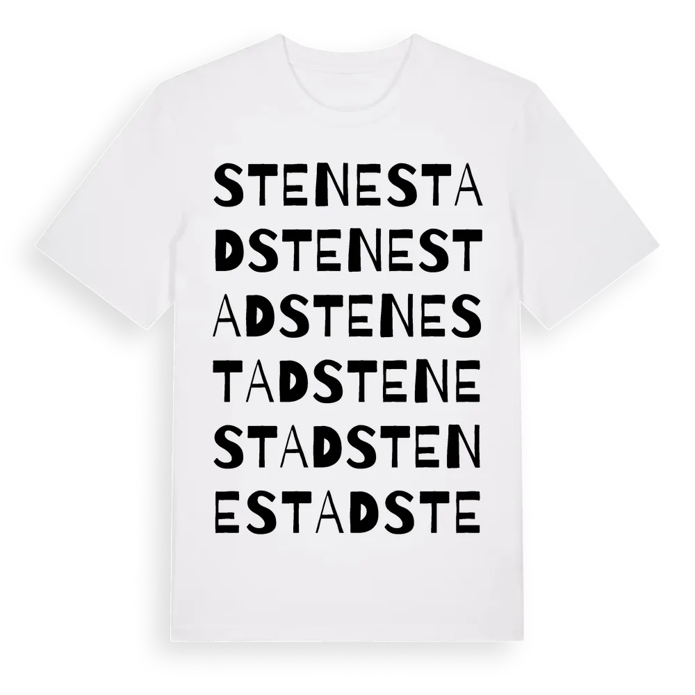 Stenestad ordlek t-shirt är inspirerad av byn Stenestad i Skåne län, Sverige. Tröjan är designad för dig som har en speciell koppling till platsen – oavsett om du bor här, har rötterna här eller bara älskar Stenestad.