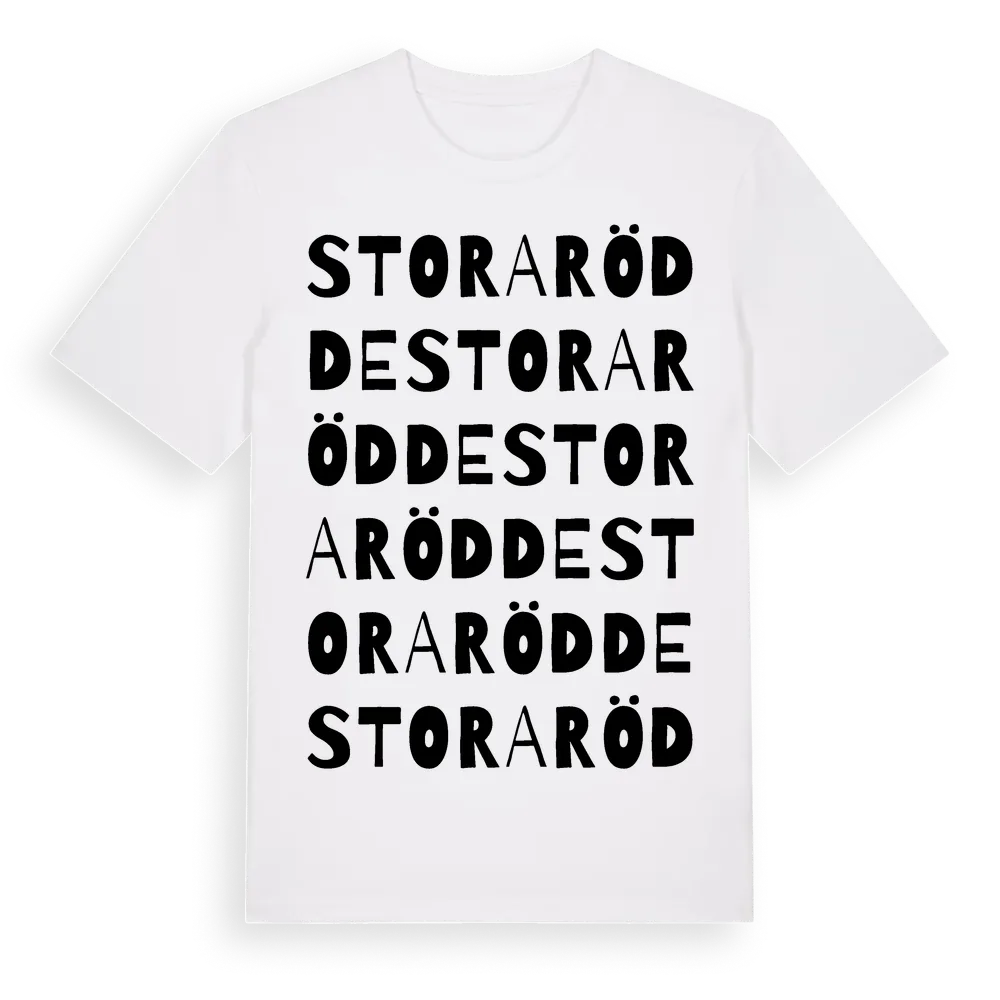 Stora Rödde ordlek t-shirt är inspirerad av byn Stora Rödde i Skåne län, Sverige. Tröjan är designad för dig som har en speciell koppling till platsen – oavsett om du bor här, har rötterna här eller bara älskar Stora Rödde.