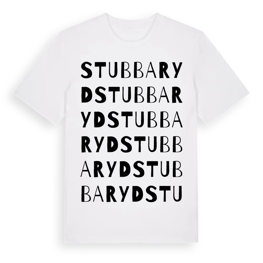 Stubbaryd ordlek t-shirt är inspirerad av Stubbaryd i Skåne län, Sverige. Tröjan är designad för dig som har en speciell koppling till platsen – oavsett om du bor här, har rötterna här eller bara älskar Stubbaryd.