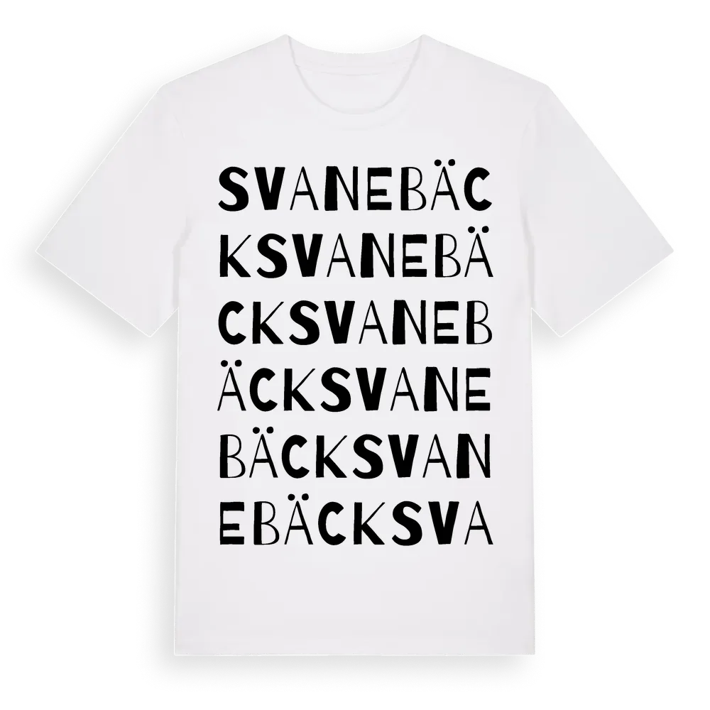 Svanebäck ordlek t-shirt är inspirerad av stadsdelen Svanebäck i Skåne län, Sverige. Tröjan är designad för dig som har en speciell koppling till platsen – oavsett om du bor här, har rötterna här eller bara älskar Svanebäck.