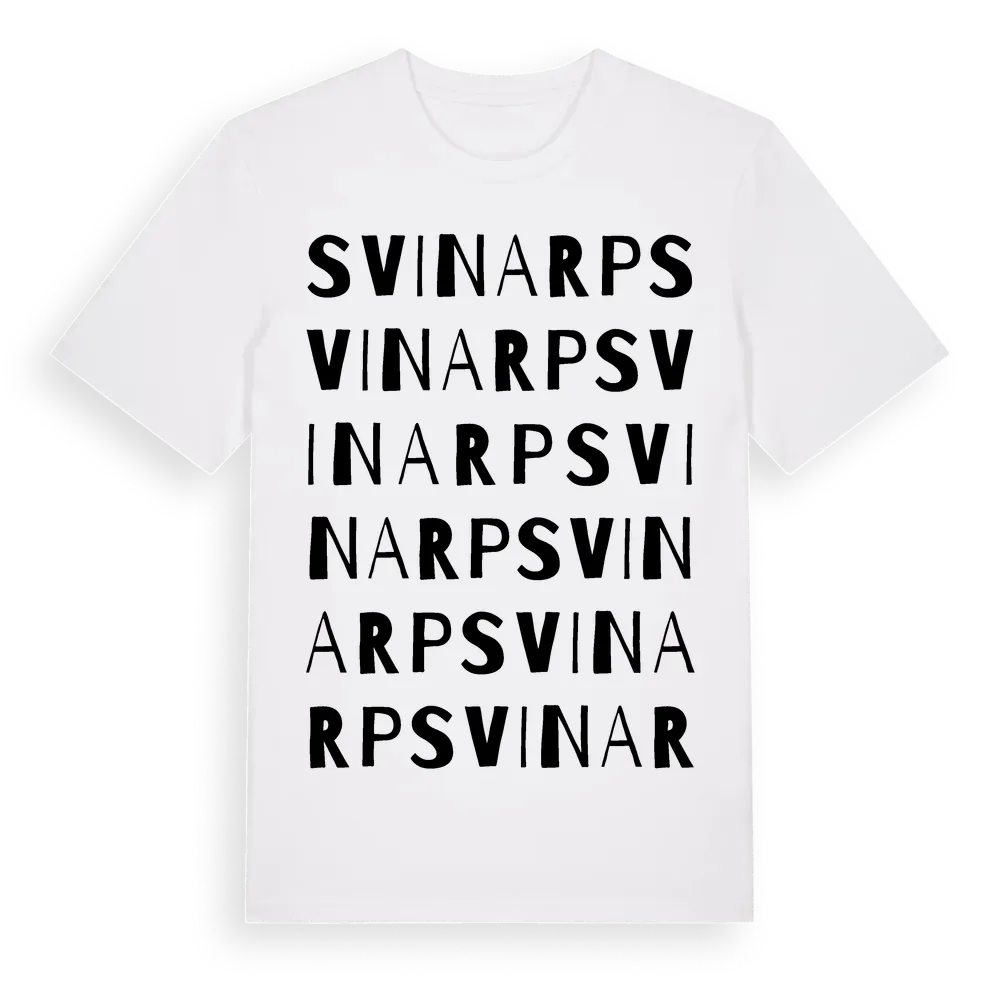 Svinarp ordlek t-shirt är inspirerad av Svinarp i Skåne län, Sverige. Tröjan är designad för dig som har en speciell koppling till platsen – oavsett om du bor här, har rötterna här eller bara älskar Svinarp.