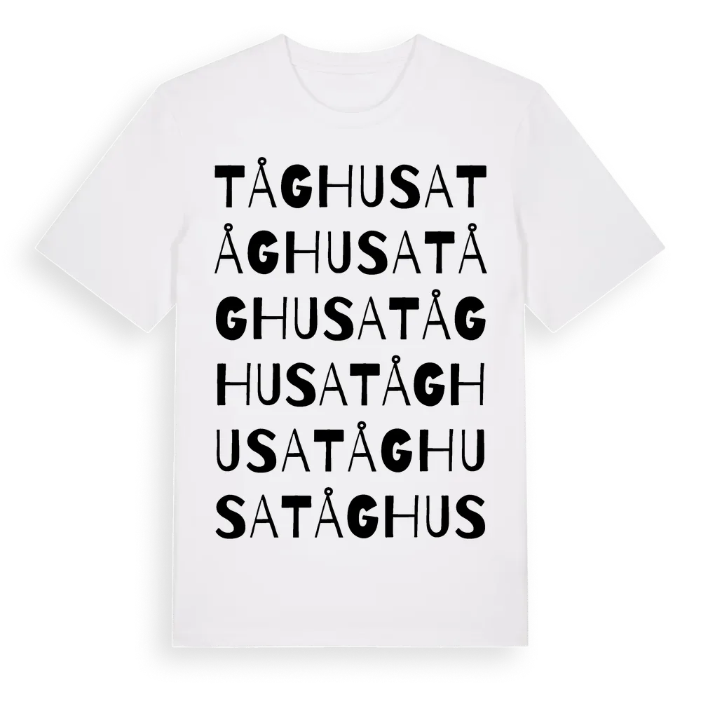 Tåghusa ordlek t-shirt är inspirerad av byn Tåghusa i Skåne län, Sverige. Tröjan är designad för dig som har en speciell koppling till platsen – oavsett om du bor här, har rötterna här eller bara älskar Tåghusa.