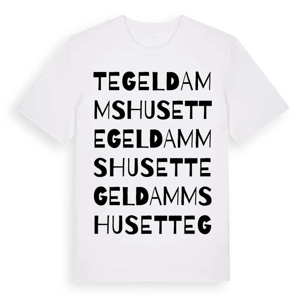 Tegeldammshuset ordlek t-shirt är inspirerad av Tegeldammshuset i Skåne län, Sverige. Tröjan är designad för dig som har en speciell koppling till platsen – oavsett om du bor här, har rötterna här eller bara älskar Tegeldammshuset.