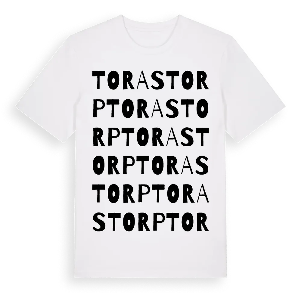 Torastorp ordlek t-shirt är inspirerad av Torastorp i Skåne län, Sverige. Tröjan är designad för dig som har en speciell koppling till platsen – oavsett om du bor här, har rötterna här eller bara älskar Torastorp.