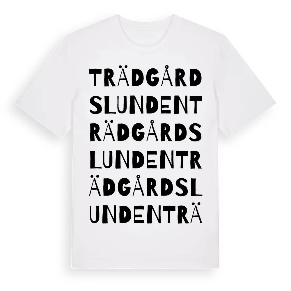 Trädgårdslunden ordlek t-shirt är inspirerad av stadsdelen Trädgårdslunden i Skåne län, Sverige. Tröjan är designad för dig som har en speciell koppling till platsen – oavsett om du bor här, har rötterna här eller bara älskar Trädgårdslunden.