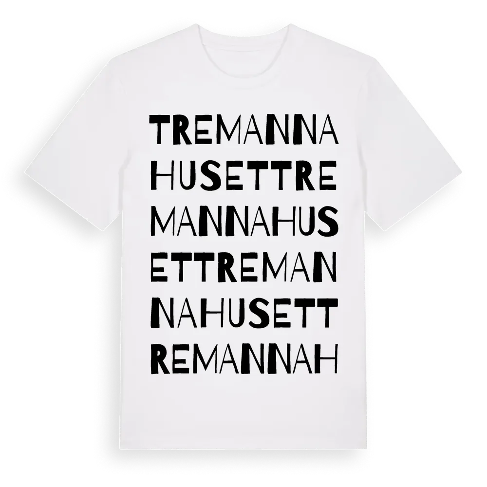 Tremannahuset ordlek t-shirt är inspirerad av Tremannahuset i Skåne län, Sverige. Tröjan är designad för dig som har en speciell koppling till platsen – oavsett om du bor här, har rötterna här eller bara älskar Tremannahuset.