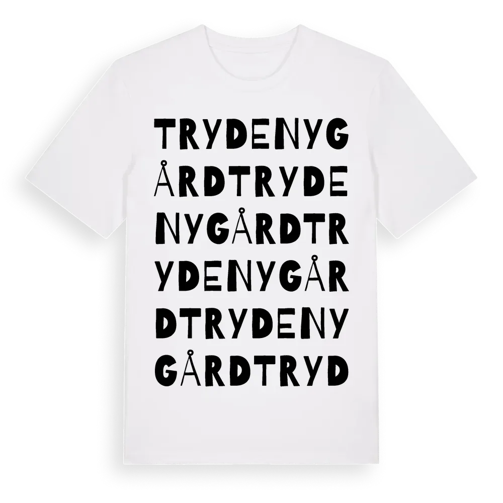 Tryde Nygård ordlek t-shirt är inspirerad av Tryde Nygård i Skåne län, Sverige. Tröjan är designad för dig som har en speciell koppling till platsen – oavsett om du bor här, har rötterna här eller bara älskar Tryde Nygård.
