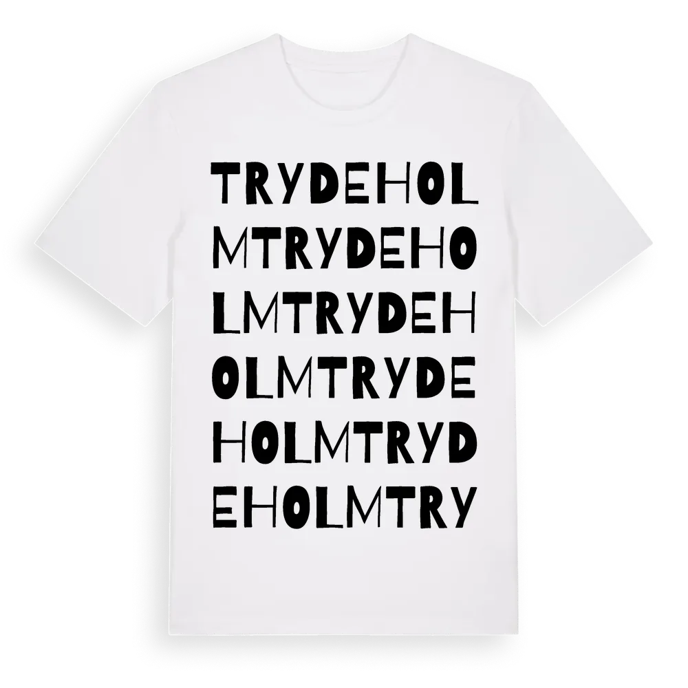 Trydeholm ordlek t-shirt är inspirerad av Trydeholm i Skåne län, Sverige. Tröjan är designad för dig som har en speciell koppling till platsen – oavsett om du bor här, har rötterna här eller bara älskar Trydeholm.