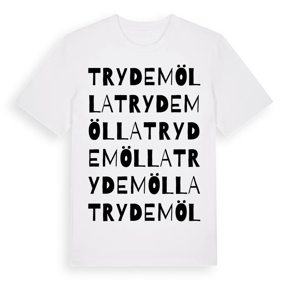 Trydemölla ordlek t-shirt är inspirerad av Trydemölla i Skåne län, Sverige. Tröjan är designad för dig som har en speciell koppling till platsen – oavsett om du bor här, har rötterna här eller bara älskar Trydemölla.