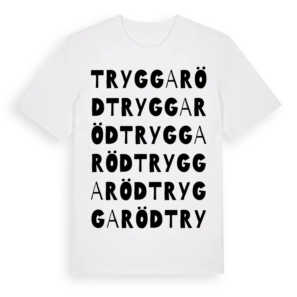 Tryggaröd ordlek t-shirt är inspirerad av byn Tryggaröd i Skåne län, Sverige. Tröjan är designad för dig som har en speciell koppling till platsen – oavsett om du bor här, har rötterna här eller bara älskar Tryggaröd.