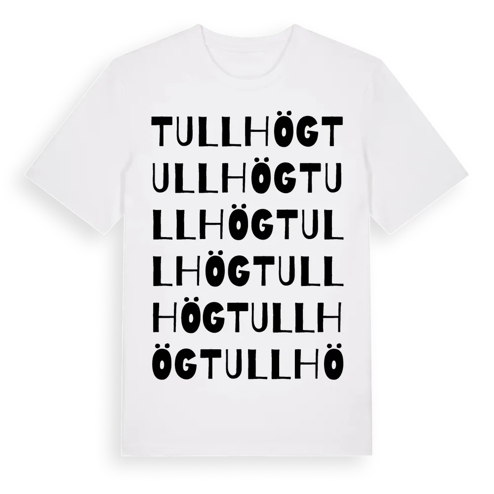 Tullhög ordlek t-shirt är inspirerad av byn Tullhög i Skåne län, Sverige. Tröjan är designad för dig som har en speciell koppling till platsen – oavsett om du bor här, har rötterna här eller bara älskar Tullhög.