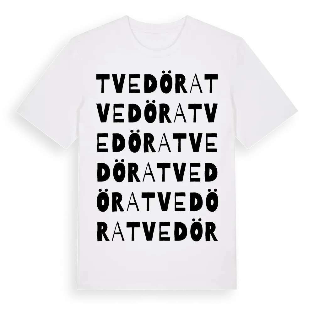 Tvedöra ordlek t-shirt är inspirerad av byn Tvedöra i Skåne län, Sverige. Tröjan är designad för dig som har en speciell koppling till platsen – oavsett om du bor här, har rötterna här eller bara älskar Tvedöra.