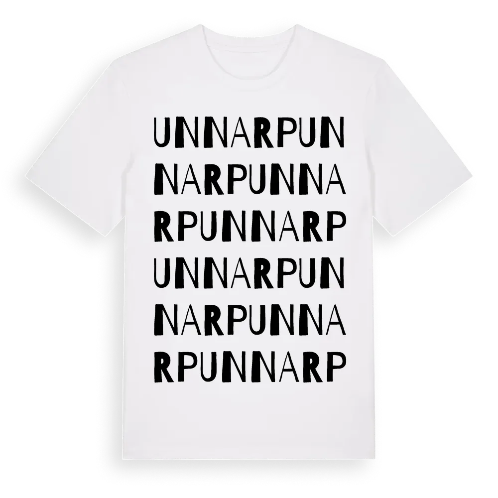 Unnarp ordlek t-shirt är inspirerad av byn Unnarp i Skåne län, Sverige. Tröjan är designad för dig som har en speciell koppling till platsen – oavsett om du bor här, har rötterna här eller bara älskar Unnarp.