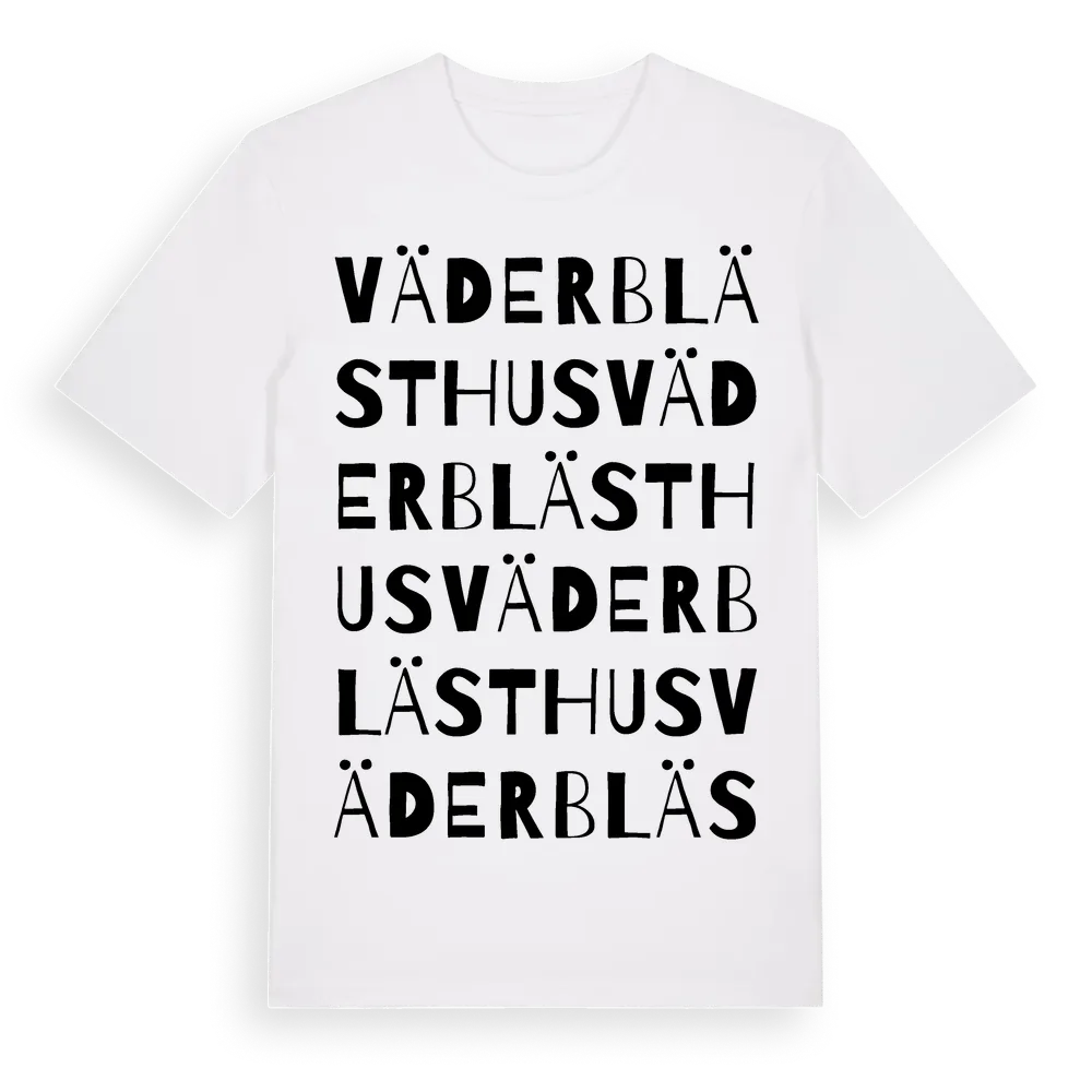 Väderblästhus ordlek t-shirt är inspirerad av Väderblästhus i Skåne län, Sverige. Tröjan är designad för dig som har en speciell koppling till platsen – oavsett om du bor här, har rötterna här eller bara älskar Väderblästhus.