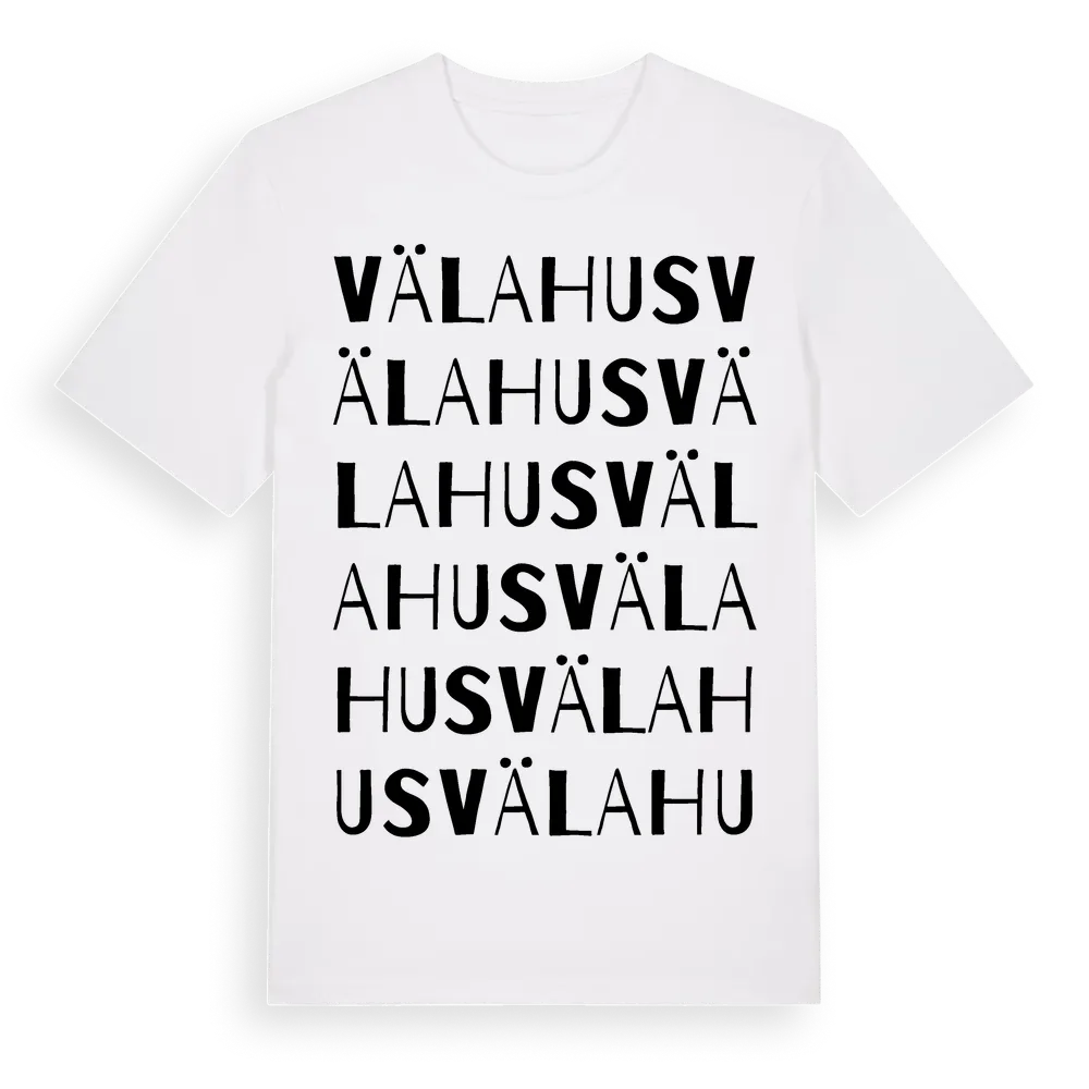 Välahus ordlek t-shirt är inspirerad av Välahus i Skåne län, Sverige. Tröjan är designad för dig som har en speciell koppling till platsen – oavsett om du bor här, har rötterna här eller bara älskar Välahus.