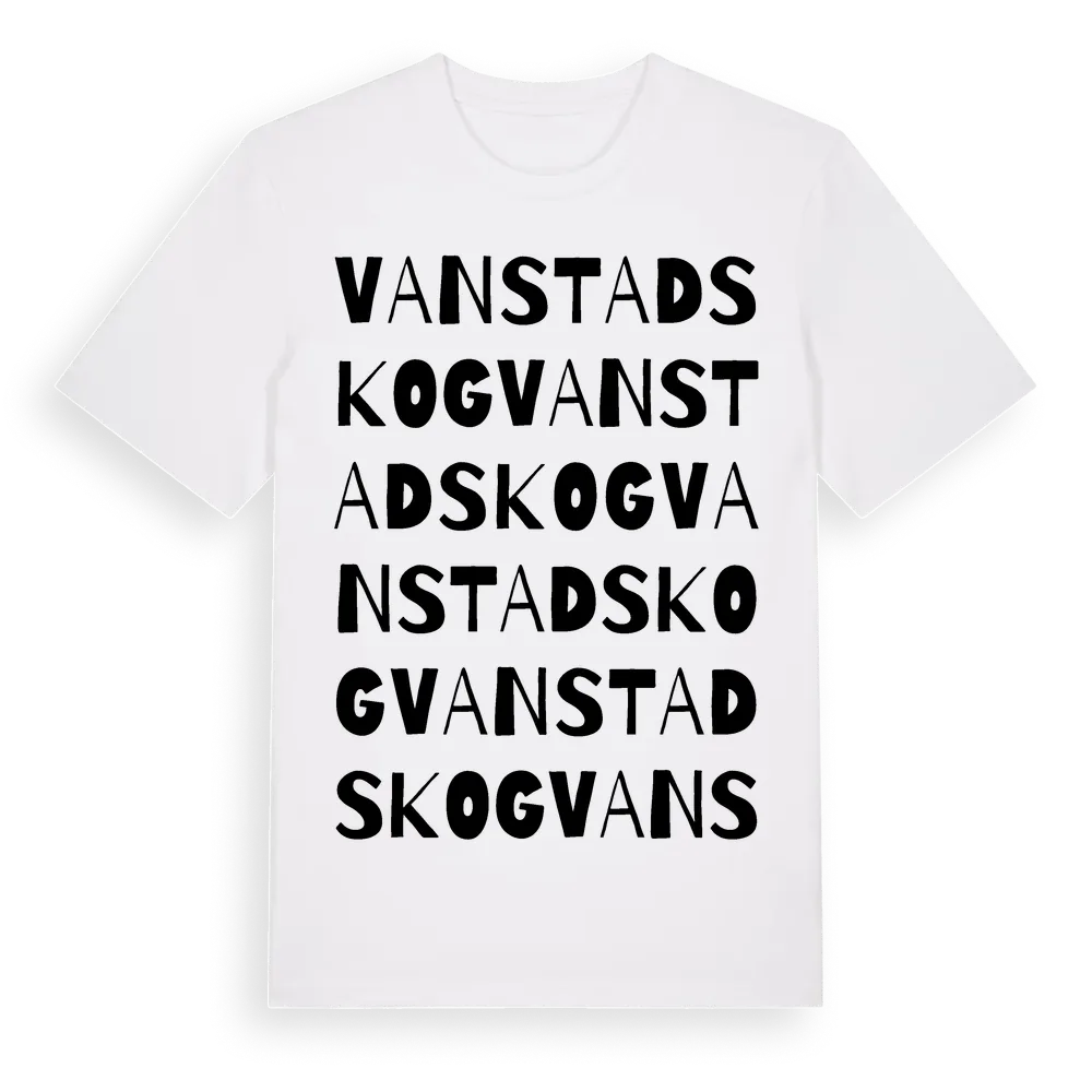 Vanstadskog ordlek t-shirt är inspirerad av byn Vanstadskog i Skåne län, Sverige. Tröjan är designad för dig som har en speciell koppling till platsen – oavsett om du bor här, har rötterna här eller bara älskar Vanstadskog.