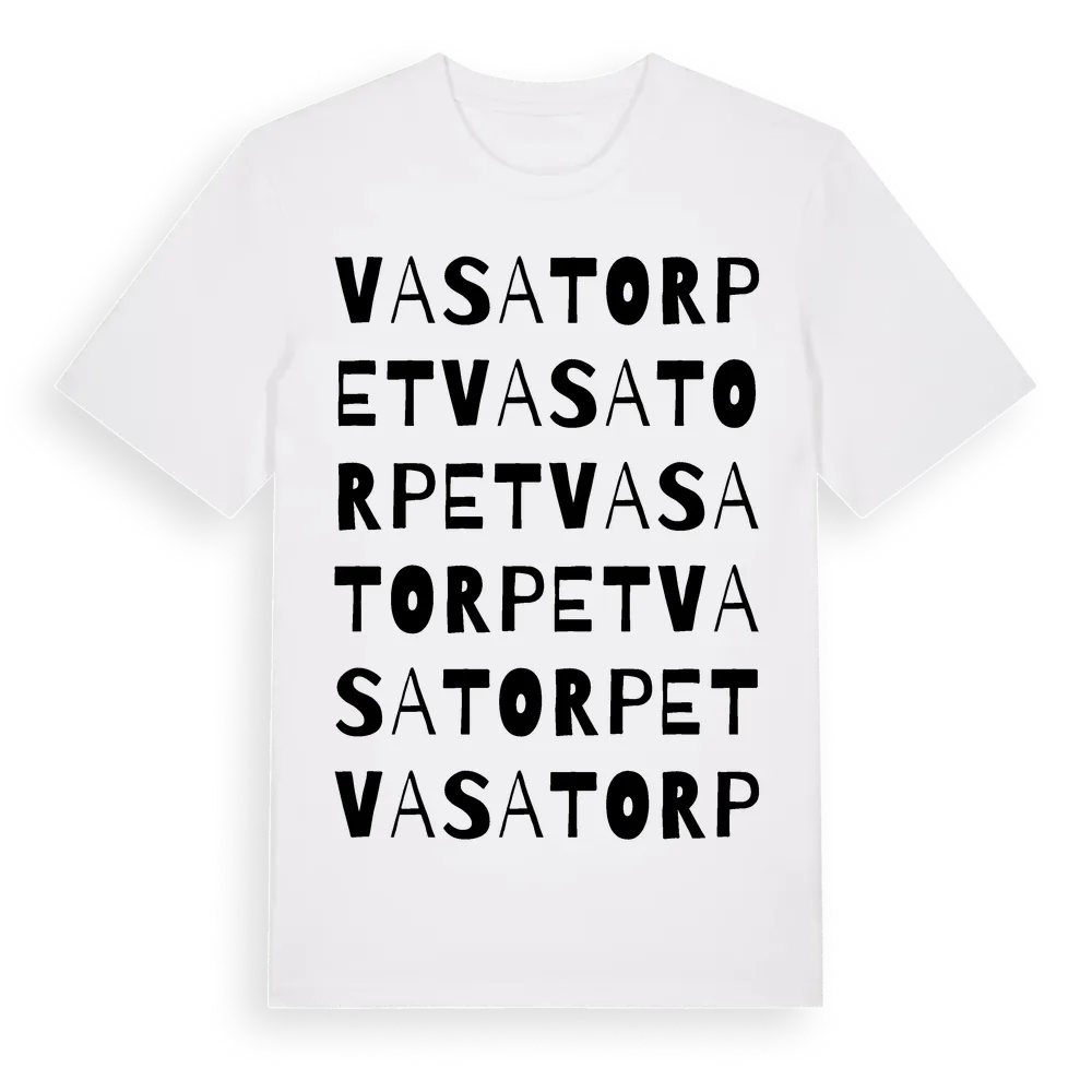 Vasatorpet ordlek t-shirt är inspirerad av Vasatorpet i Skåne län, Sverige. Tröjan är designad för dig som har en speciell koppling till platsen – oavsett om du bor här, har rötterna här eller bara älskar Vasatorpet.