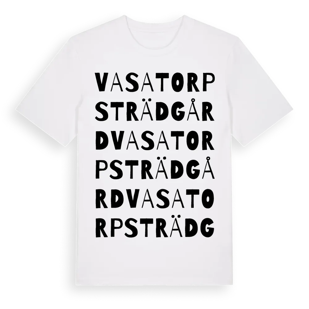 Vasatorps Trädgård ordlek t-shirt är inspirerad av stadsdelen Vasatorps Trädgård i Skåne län, Sverige. Tröjan är designad för dig som har en speciell koppling till platsen – oavsett om du bor här, har rötterna här eller bara älskar Vasatorps Trädgård.