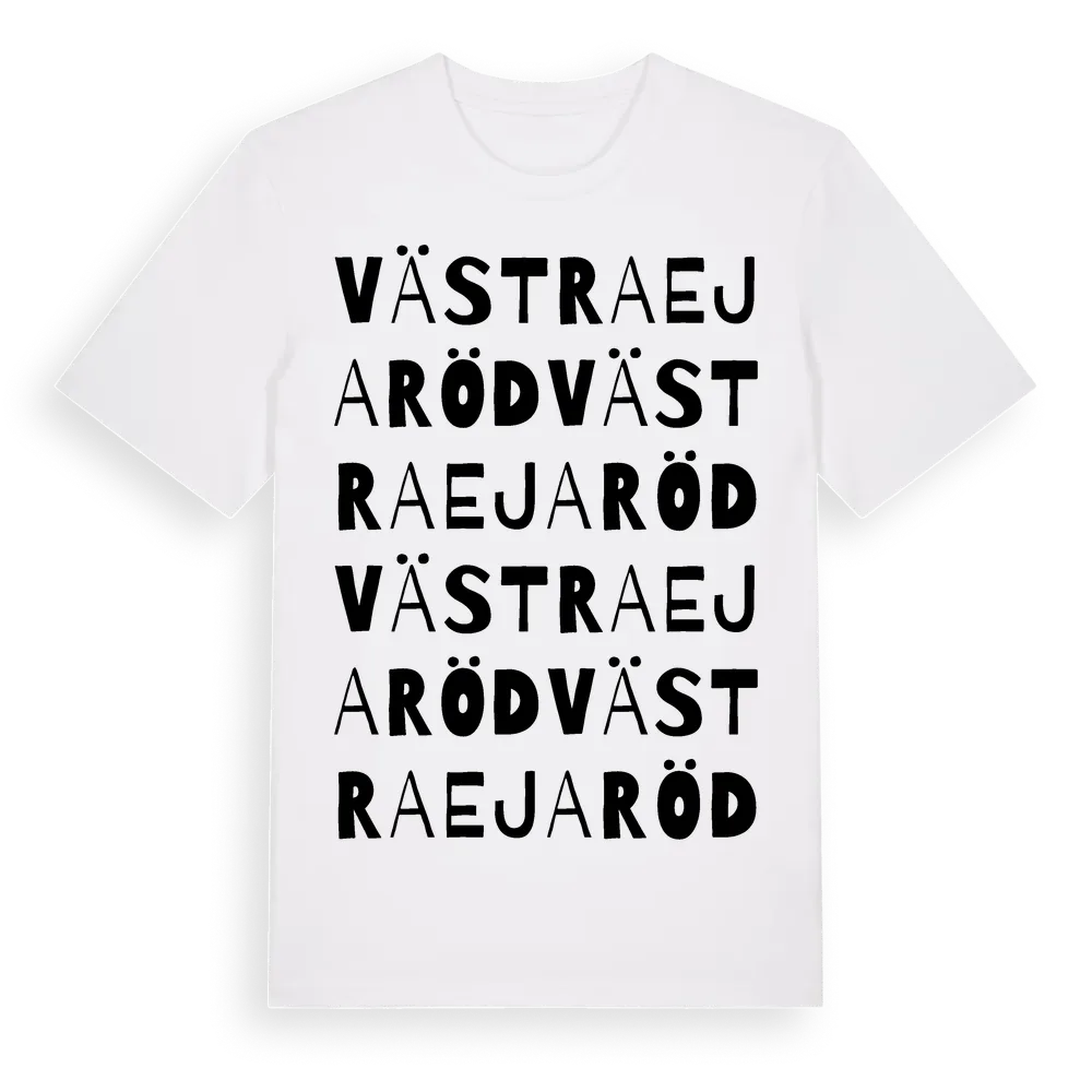 Västra Ejaröd ordlek t-shirt är inspirerad av Västra Ejaröd i Skåne län, Sverige. Tröjan är designad för dig som har en speciell koppling till platsen – oavsett om du bor här, har rötterna här eller bara älskar Västra Ejaröd.