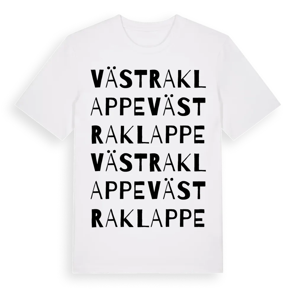 Västra Klappe ordlek t-shirt är inspirerad av byn Västra Klappe i Skåne län, Sverige. Tröjan är designad för dig som har en speciell koppling till platsen – oavsett om du bor här, har rötterna här eller bara älskar Västra Klappe.
