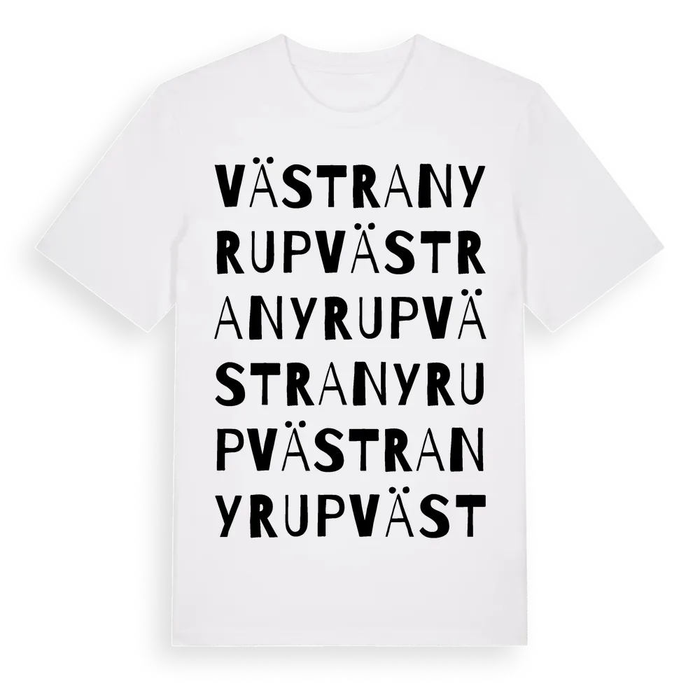 Västra Nyrup ordlek t-shirt är inspirerad av Västra Nyrup i Skåne län, Sverige. Tröjan är designad för dig som har en speciell koppling till platsen – oavsett om du bor här, har rötterna här eller bara älskar Västra Nyrup.