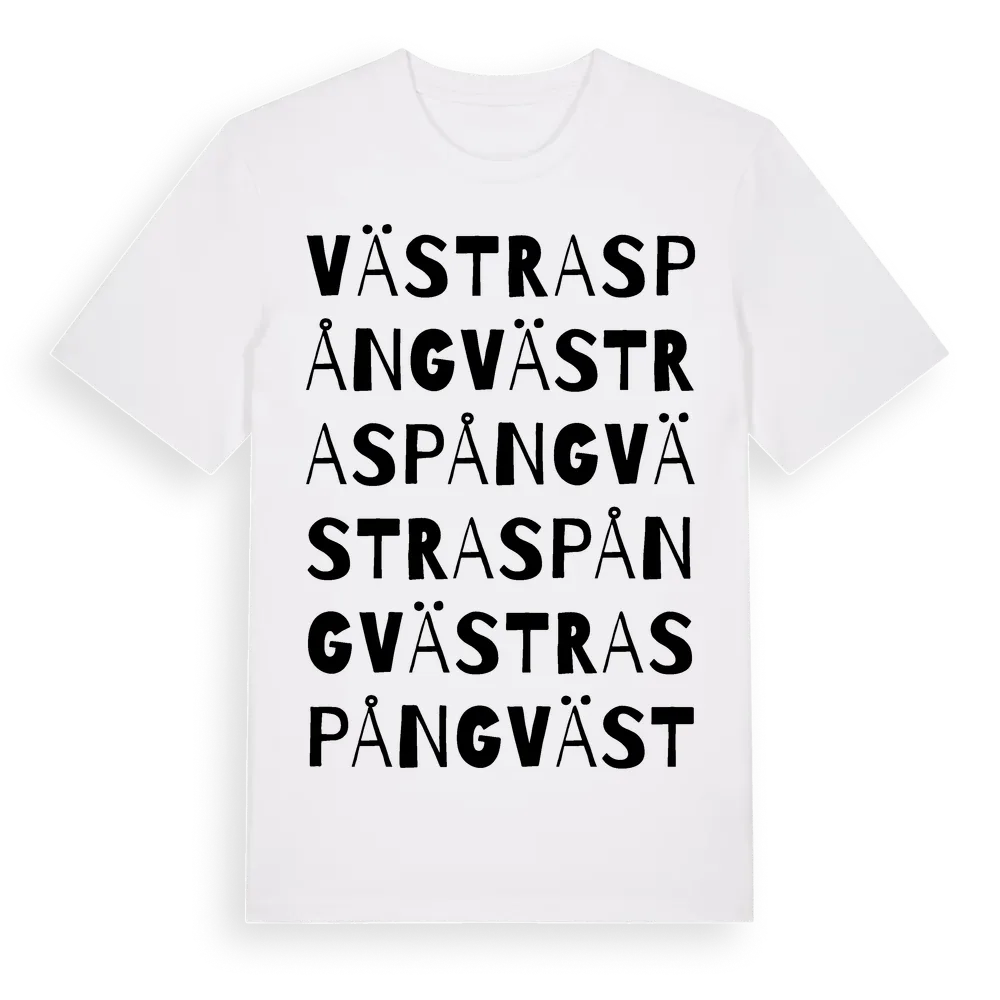 Västra Spång ordlek t-shirt är inspirerad av byn Västra Spång i Skåne län, Sverige. Tröjan är designad för dig som har en speciell koppling till platsen – oavsett om du bor här, har rötterna här eller bara älskar Västra Spång.