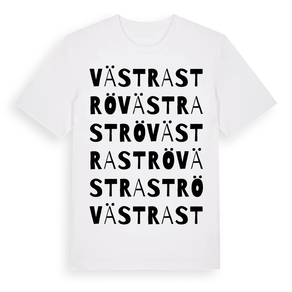 Västra Strö ordlek t-shirt är inspirerad av byn Västra Strö i Skåne län, Sverige. Tröjan är designad för dig som har en speciell koppling till platsen – oavsett om du bor här, har rötterna här eller bara älskar Västra Strö.