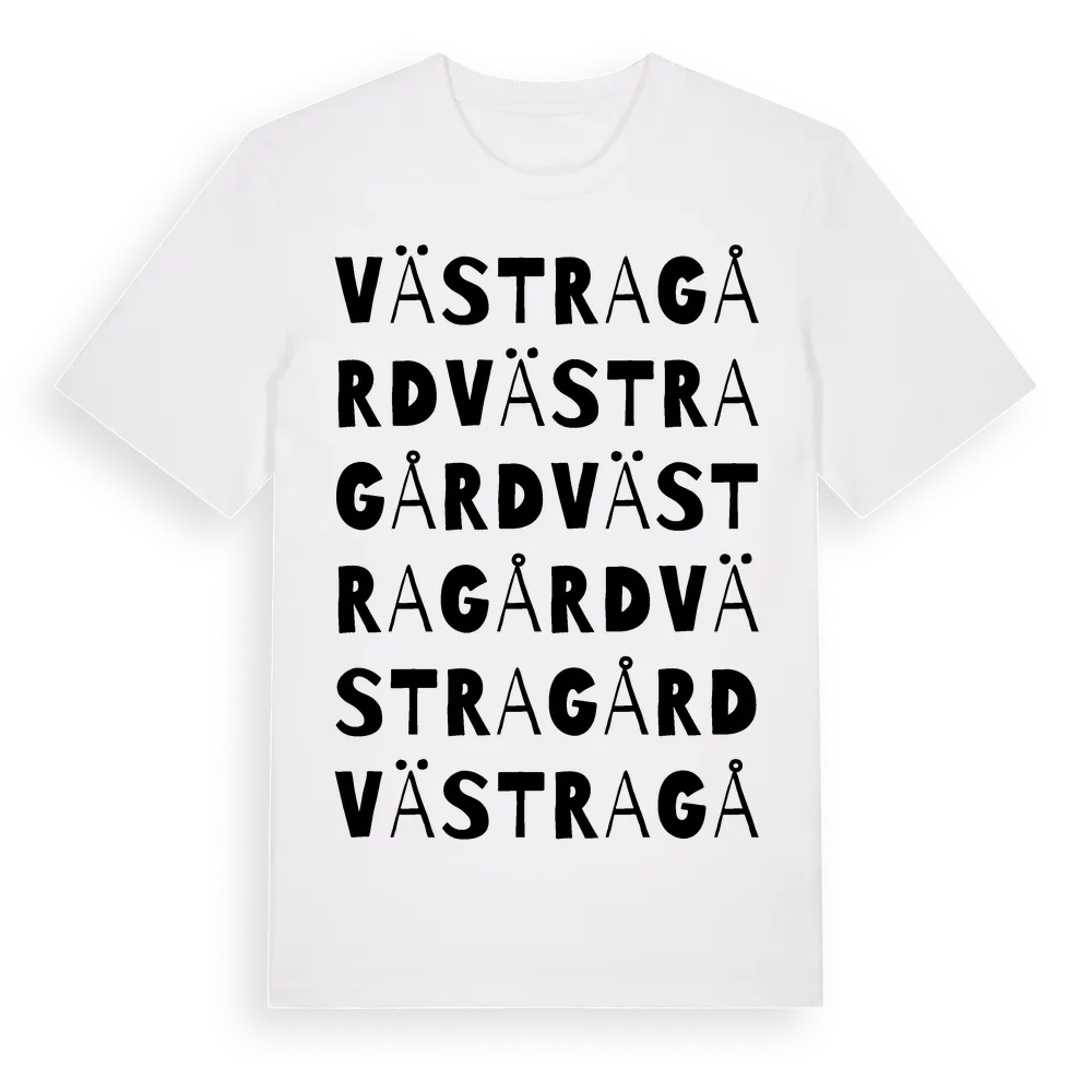 Västragård ordlek t-shirt är inspirerad av byn Västragård i Skåne län, Sverige. Tröjan är designad för dig som har en speciell koppling till platsen – oavsett om du bor här, har rötterna här eller bara älskar Västragård.