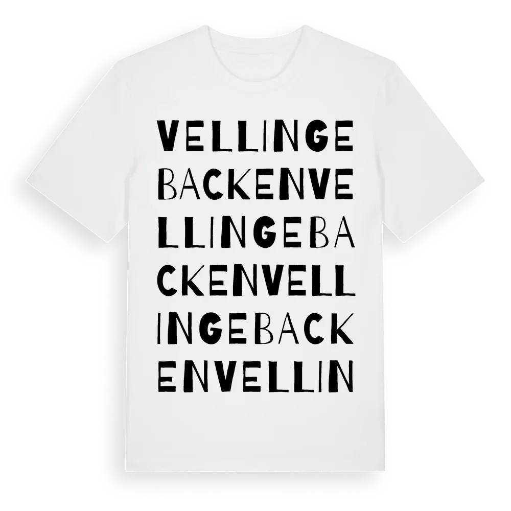 Vellingebacken ordlek t-shirt är inspirerad av byn Vellingebacken i Skåne län, Sverige. Tröjan är designad för dig som har en speciell koppling till platsen – oavsett om du bor här, har rötterna här eller bara älskar Vellingebacken.