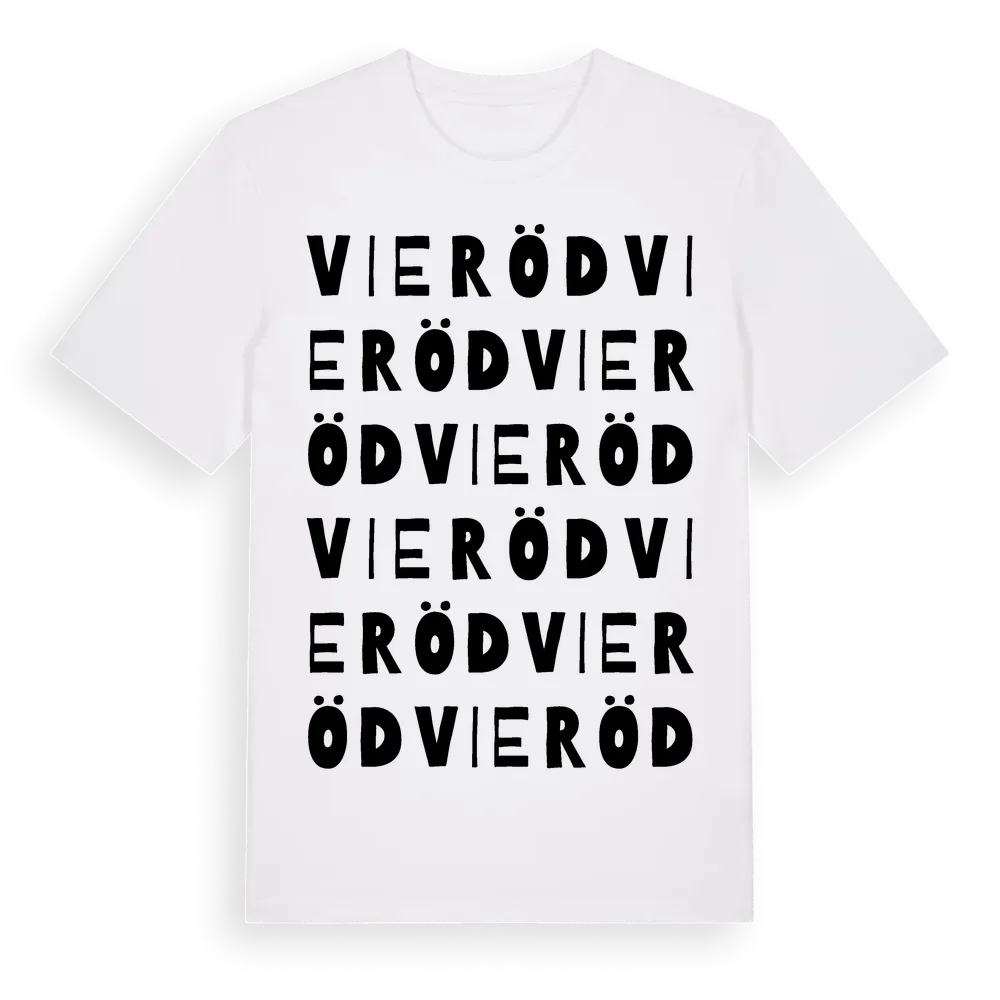 Vieröd ordlek t-shirt är inspirerad av Vieröd i Skåne län, Sverige. Tröjan är designad för dig som har en speciell koppling till platsen – oavsett om du bor här, har rötterna här eller bara älskar Vieröd.