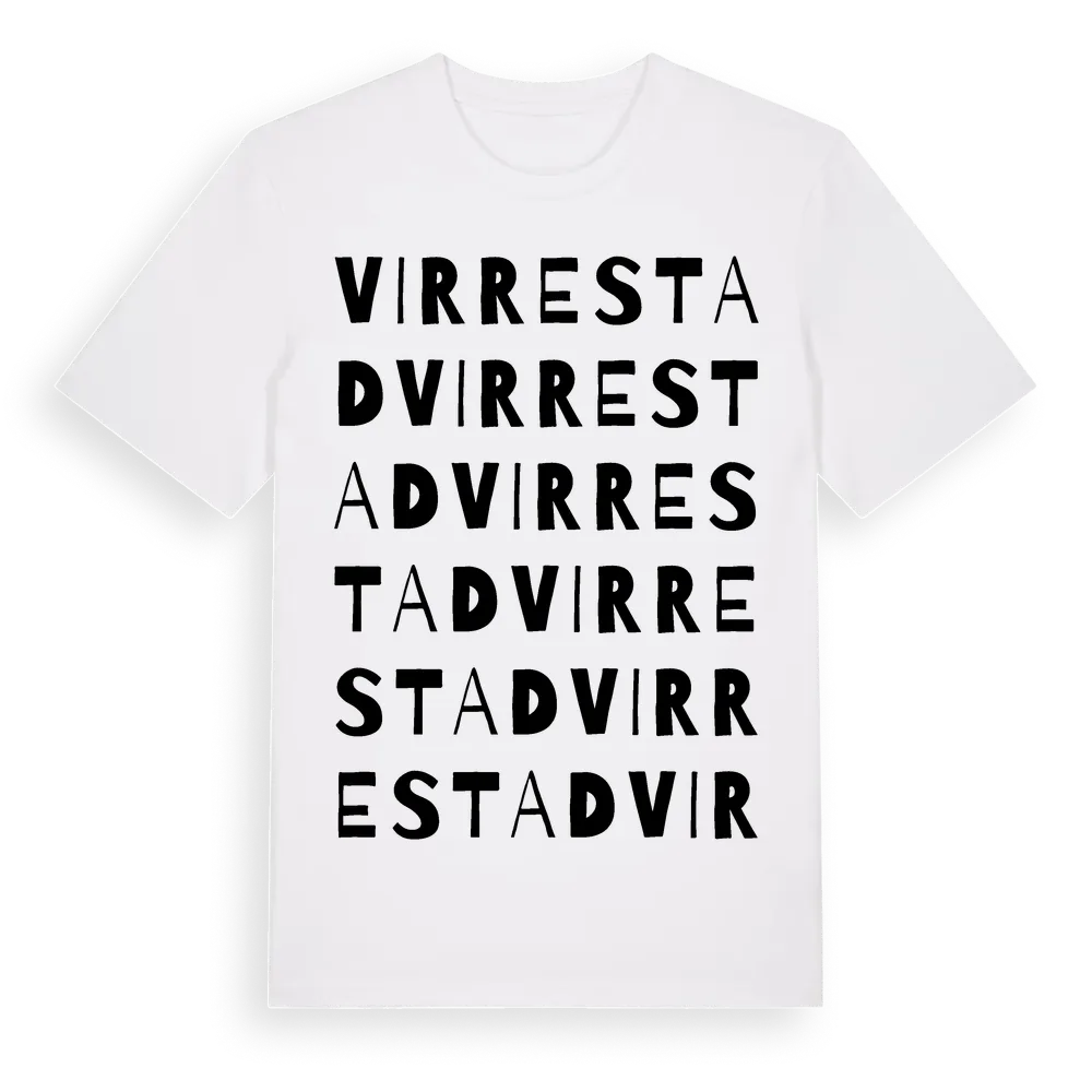 Virrestad ordlek t-shirt är inspirerad av byn Virrestad i Skåne län, Sverige. Tröjan är designad för dig som har en speciell koppling till platsen – oavsett om du bor här, har rötterna här eller bara älskar Virrestad.