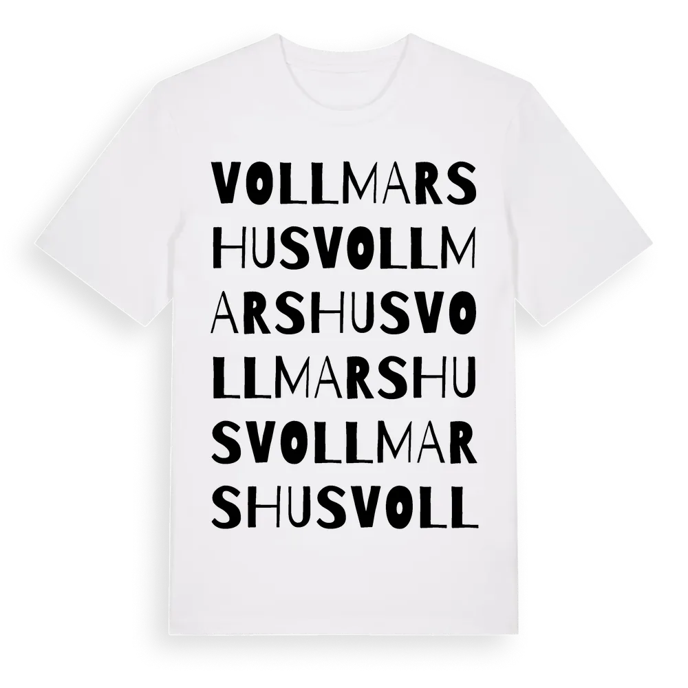 Vollmarshus ordlek t-shirt är inspirerad av Vollmarshus i Skåne län, Sverige. Tröjan är designad för dig som har en speciell koppling till platsen – oavsett om du bor här, har rötterna här eller bara älskar Vollmarshus.