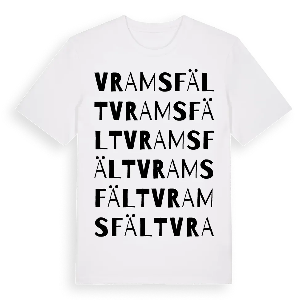 Vramsfält ordlek t-shirt är inspirerad av Vramsfält i Skåne län, Sverige. Tröjan är designad för dig som har en speciell koppling till platsen – oavsett om du bor här, har rötterna här eller bara älskar Vramsfält.