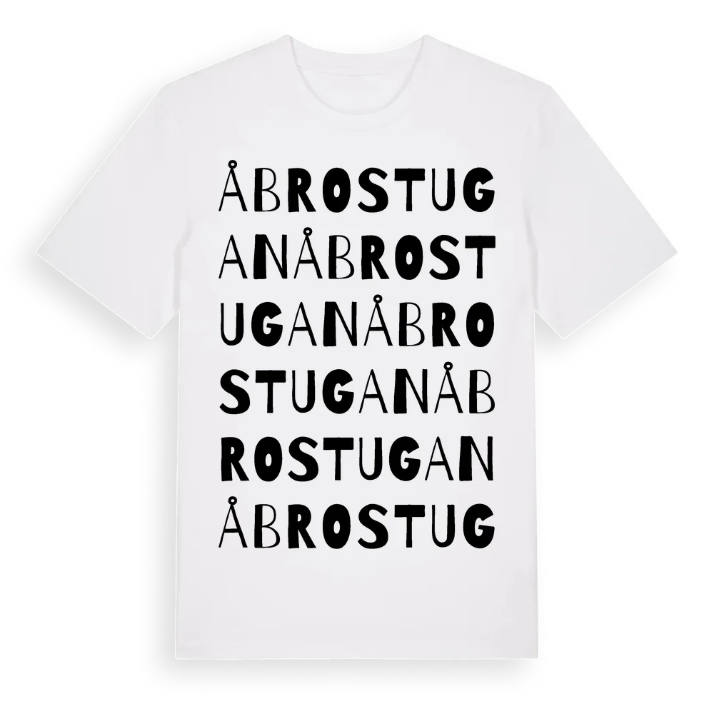 Åbrostugan ordlek t-shirt är inspirerad av Åbrostugan i Södermanlands län, Sverige. Tröjan är designad för dig som har en speciell koppling till platsen – oavsett om du bor här, har rötterna här eller bara älskar Åbrostugan.