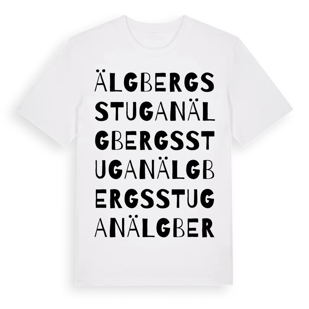 Älgbergsstugan ordlek t-shirt är inspirerad av Älgbergsstugan i Södermanlands län, Sverige. Tröjan är designad för dig som har en speciell koppling till platsen – oavsett om du bor här, har rötterna här eller bara älskar Älgbergsstugan.