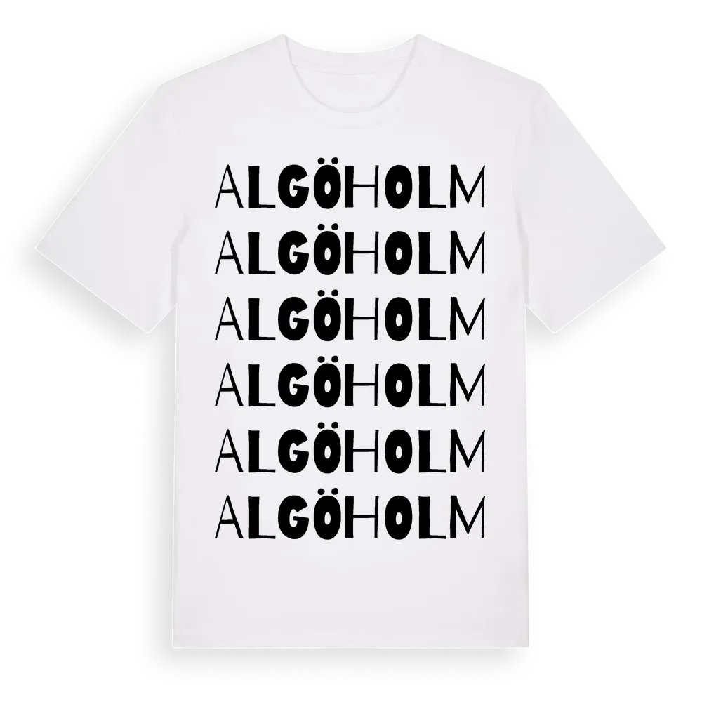 Algöholm ordlek t-shirt är inspirerad av ön Algöholm i Södermanlands län, Sverige. Tröjan är designad för dig som har en speciell koppling till platsen – oavsett om du bor här, har rötterna här eller bara älskar Algöholm.